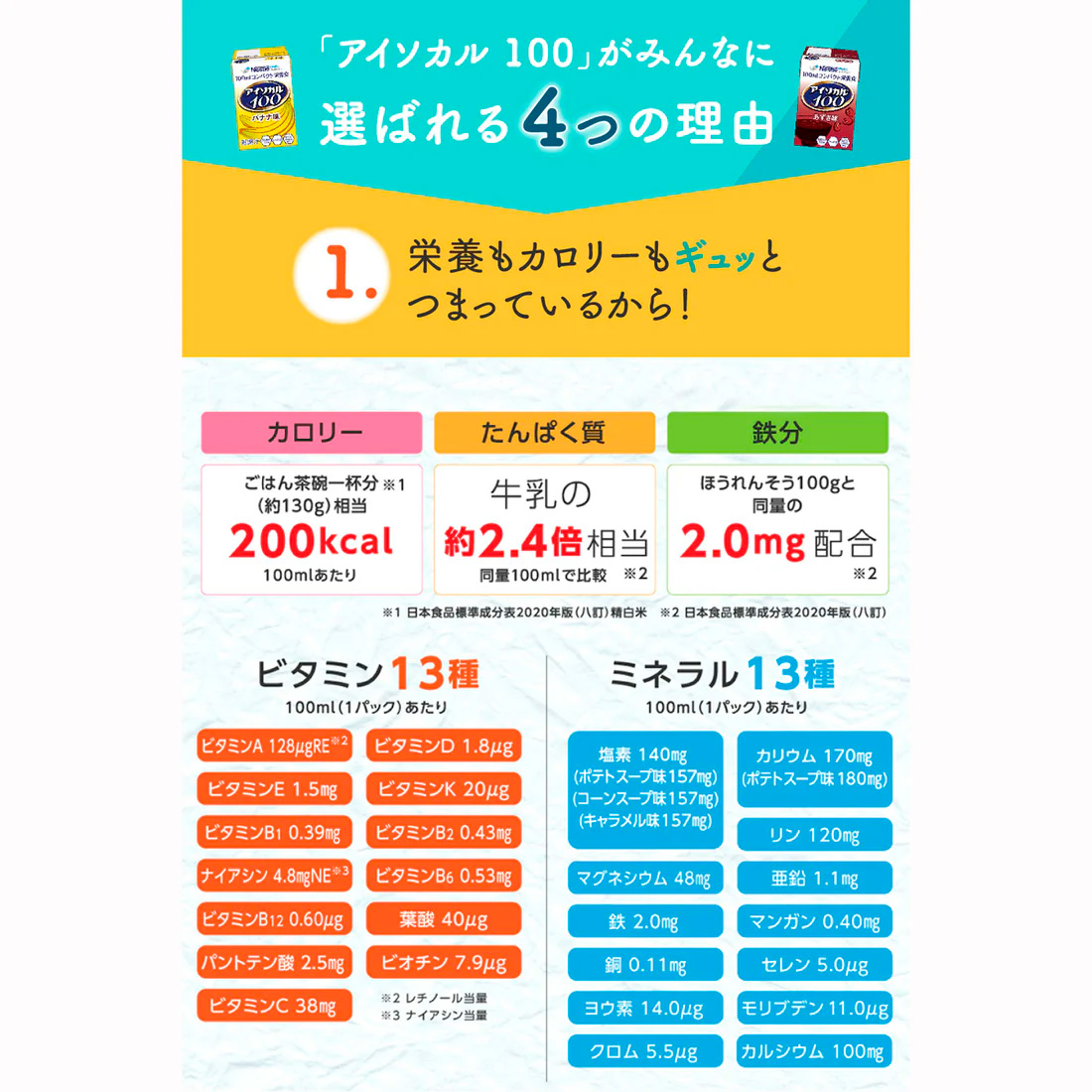 * 13種類のビタミン: ビタミンA,ビタミンD,ビタミンE,ビタミンK,ビタミンB1,ビタミンB2,ナイアシン,ビタミンB6,ビタミンB12,葉酸,パントテン酸,ビオチン,ビタミンC