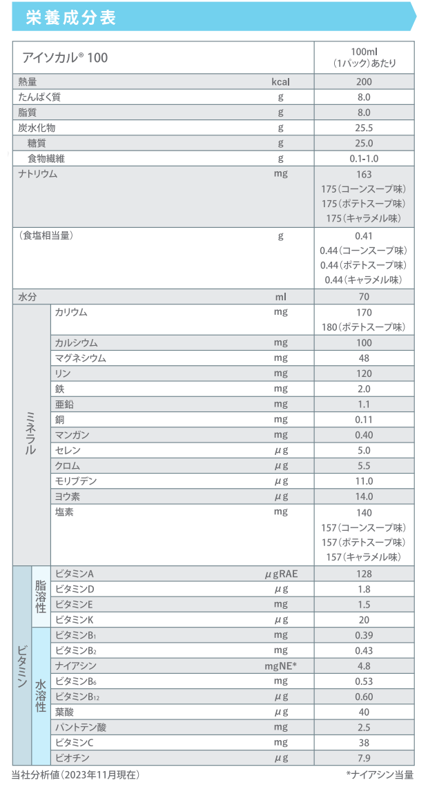 | 注意事項 | 【使用上の注意】 ・静脈内等へは絶対に注入しないでください。 ・内容成分が浮遊、沈殿することがありますが、品質には問題ありません。 ・パックのまま電子レンジで加熱しないでください。 ・パックの漏れや膨張がみられるものは使用しないでください。 ・開封時に異味、異臭のあるものは使用しないでください。 ・開封後はすぐにご使用ください。 ・必要に応じて医師・管理栄養士等にご相談ください。 ・原材料に含まれるアレルゲン(28品目中):乳、大豆、ゼラチン 【取り扱い上の注意】 ・常温で保存できますが、なるべく涼しい所に保管してください。 ・本製品には紙製のストレートストローが付属しています。ストローの一部がパックから突出していますので、取り扱いにご注意ください。 |