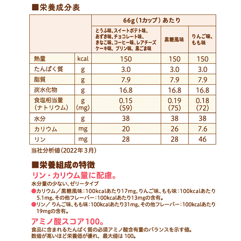 | 注意事項 | 【使用上の注意】 ・医師・栄養士等の指導にもとづいて使用されることをお勧めします。 ・カップに漏れや膨張のあるものは使用しないでください。 ・カップの底に成分の白い粉がみられることがありますが、品質には問題ありません。 ・冷凍保存解凍後や湯煎後、食感が変化する恐れがあります。かむ力、飲み込む力が気になる方は必ずご確認の上、ご使用ください。 なお、栄養成分に影響はありません。 ・原材料に含まれるアレルゲン(28品目中):乳、大豆(りんご味・もも味は大豆のみ) 【取り扱い上の注意】 ・常温で保存できますが、なるべく涼しい所で保管してください。 |