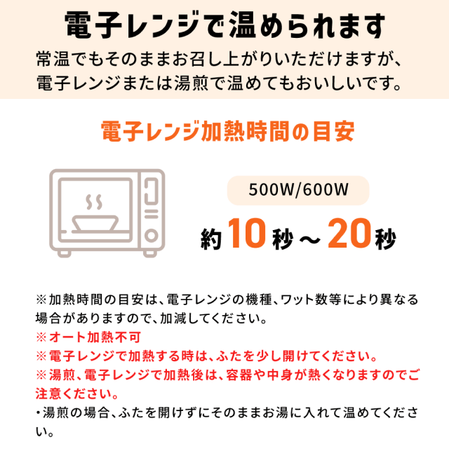 | 注意事項 | 【アレルギー情報】 原材料に含まれるアレルゲン (28品目中): 豚肉、 ゼラチン (玉子がゆは、 小麦、卵、大豆、鶏肉、豚肉、ゼラチン) 【使用上・取扱い上の注意】 ● 本品は湿気、冷蔵を避け、常温で保管してください。 ● 開封後はすみやかにご使用ください。 ● プラスチックカップ入りです。 カップに漏れや膨張のあるものは使用しないでください。 ● 開封時に異様な変色、 異臭や凝固のあるものは使用しないでください。 ● 常温、もしくは湯煎 電子レンジで加熱してお召し上がりいただけます。 電子レンジで加熱する時は、ふたを少し開けてください。 電子レンジ加熱時間の目安 (500W / 600W) 約 10秒~20秒 ※加熱時間の目安は、電子レンジの機種、 ワット数等により異なる場合がありますので加減してください。 ・オート加熱不可 ・湯煎の場合、袋に製品を入れて温めてください。 ● 湯煎 電子レンジで加熱後は、容器や中身が熱くなりますのでご注意ください。 ● 食事介助が必要な方に使用される場合は、 介助者が嚥下の様子を見守ってください。 ● 医師・栄養士等の指導にもとづいて使用されることをお勧めします。 ● 低温で保存すると、食感が変化(硬化)したり、風味が劣化したり、 離水 (米等に含まれる水分が分離)することがあります。 そのような場合は、 少し温めてから、かき混ぜてお召し上がりください。 |