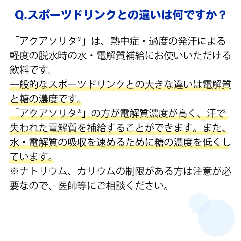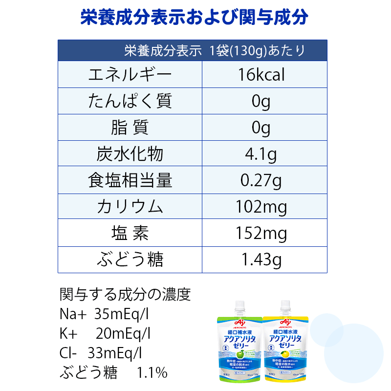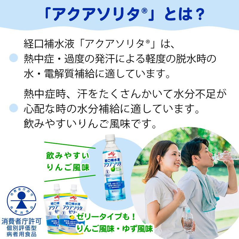 | 経口補水液「アクアソリタ®」ゼリーは、熱中症・過度の発汗による軽度の脱水時の水・電解質補給に適しています。 |