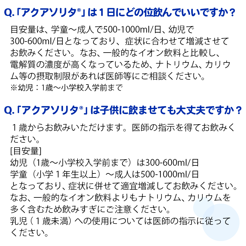 | 注意事項 | 摂取時の注意事項 ・症状に応じて適宜増減してお飲みください。 ・本品は、多く摂取することにより疾病が治癒するものではございません。 ・幼児も飲みやすい軟らかさですが、のどに詰まらせないよう注意ください。 ・医師から、熱中症・過度の発汗による軽度の脱水時の食事療法として指示された場合にご使用ください。 ・医師、薬剤師、管理栄養士等の指導に従ってお飲みください。 ・本品は、一般のイオン飲料よりも電解質の濃度が高くなっているため、ナトリウム、カリウム等の摂取制限がある方は、医師等の専門家に相談ください。 ご使用上の注意 (製品共通) 〇生後、3か月以降の乳児からお飲みいただけますが、乳児は腎機能が未成熟であるため、特に6ヶ月未満は過剰摂取にご注意ください。必要に応じて医師などの専門家にご相談ください。 ○ 一般のイオン飲料より電解質の濃度が高くなっているのでナトリウム、カリウム等の摂取制限を受けておられる方は医師・薬剤師等の専門家にご相談ください。 ○直射日光や高温、多湿を避けて保存してください。 (ゼリータイプ) [容器のフチの取扱にご注意ください] ◆←この部分をもってお開けください。 ●医師から、熱中症・過度の発汗による軽度の脱水時の食事療法として指示された場合にご使用ください。 ●医師、薬剤師、管理栄養士等の指導に従ってお飲みください。 ●本品は、一般のイオン飲料よりも電解質の濃度が高くなっているため、ナトリウム、カリウム等の摂取制限がある方は、医師等の専門家に相談ください。 |