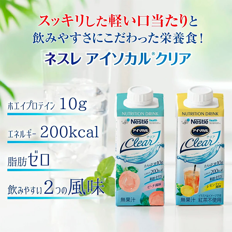アイソカルクリアは、さわやかな甘さとすっきりとした口当たりでたんぱく質とエネルギーを手軽に摂取できます。