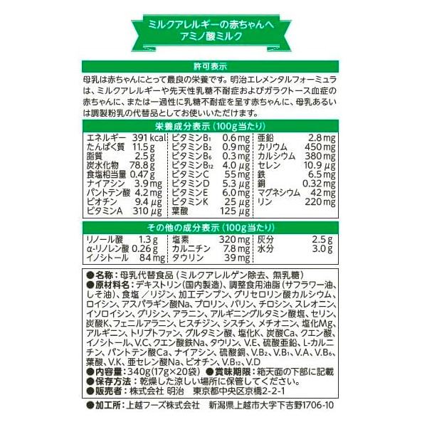 原材料名:デキストリン(国内製造)、調整食用油脂(サフラワー油、しそ油)、食塩/加工デンプン、リジン、グルタミン酸、グリセロリン酸カルシウム、ロイシン、アスパラギン酸Na、プロリン、炭酸K、バリン、チロシン、スレオニン、イソロイシン、グリシン、アラニン、アルギニングルタミン酸塩、セリン、フェニルアラニン、硫酸Mg、シスチン、メチオニン、ヒスチジン、アルギニン、トリプトファン、炭酸Ca、イノシトール、V.C、リン酸Na、クエン酸鉄Na、クエン酸、タウリン、塩化K、V.E、硫酸亜鉛、L-カルニチン、パントテン酸Ca、ナイアシン、硫酸銅、V.B2、V.B1、V.A、V.B6、葉酸、V.K、亜セレン酸Na、ビオチン、V.B12、V.D